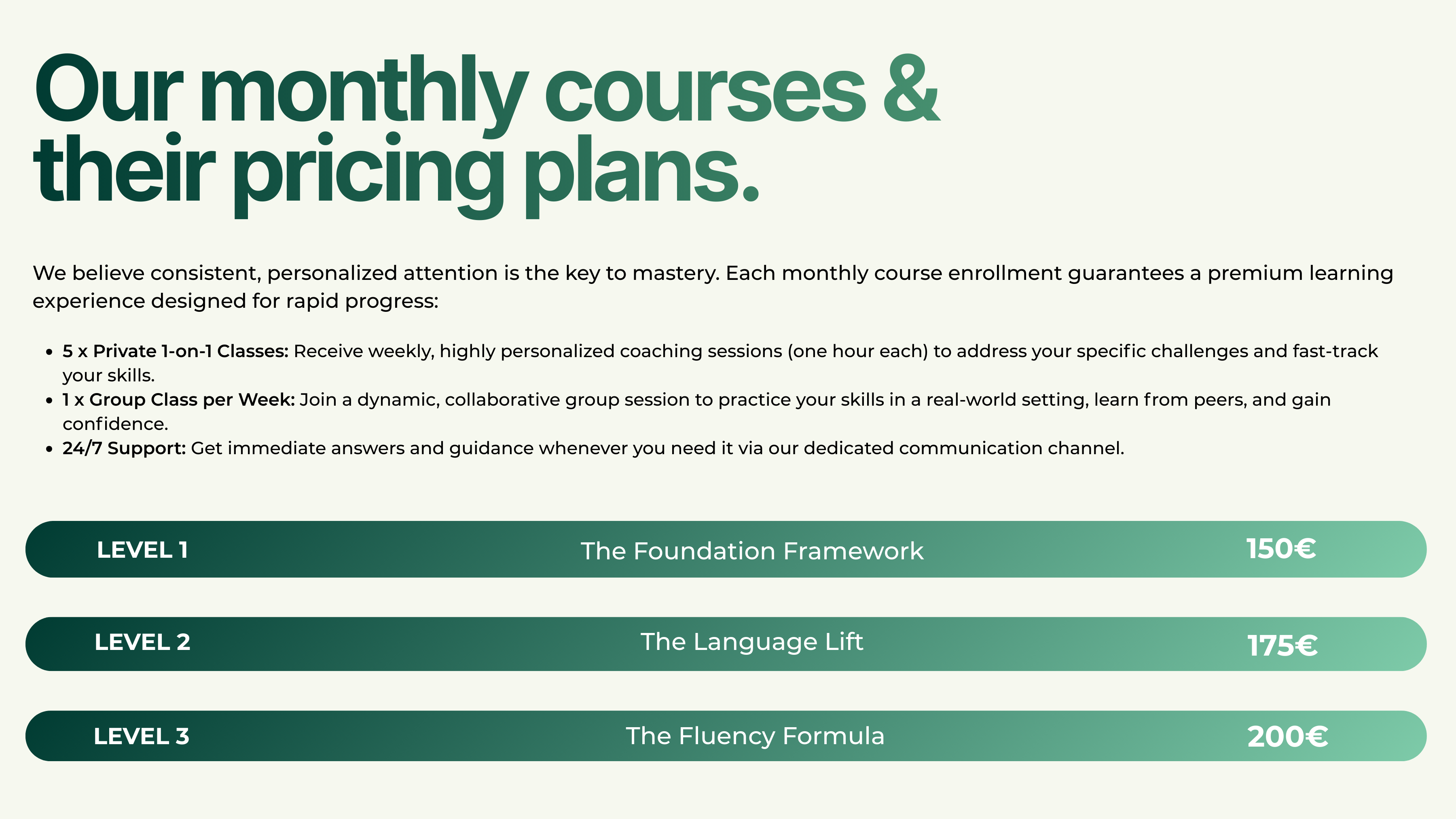 We also offer recorded courses and materials that you can access anytime, so you can review lessons and keep learning at your own pace between live sessions.